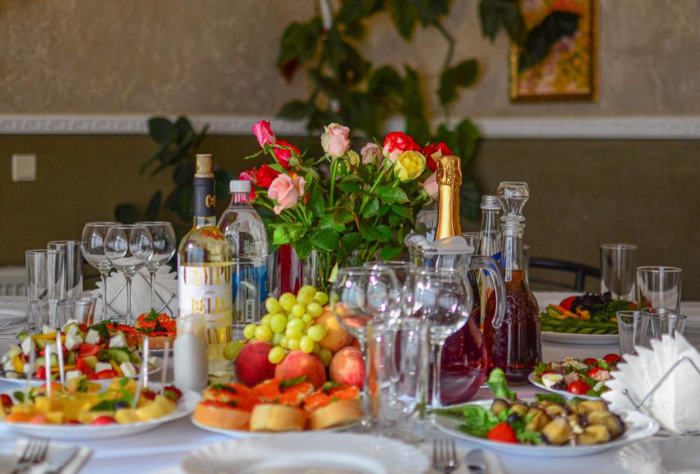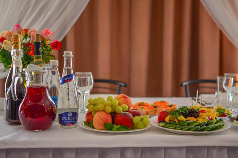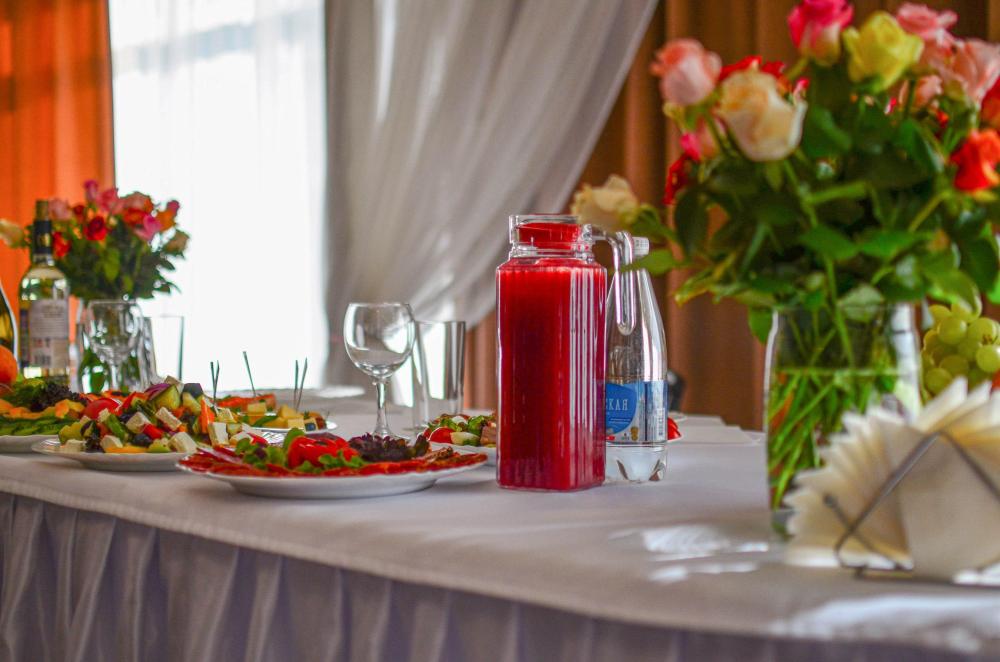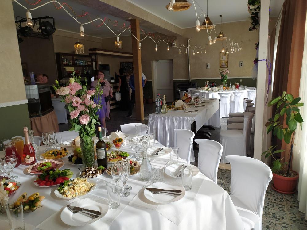 Торжественный зал, украшенный белым текстилем, с деревянной аркой и отдельным столом для виновников торжества. (скатерти и чехлы на стулья - комплект 250 р/на человека)